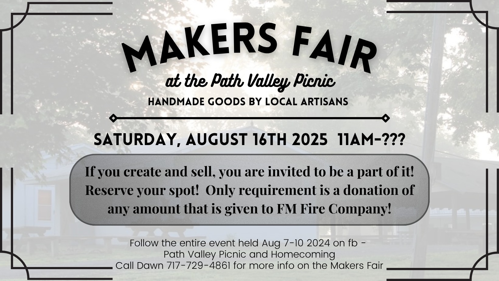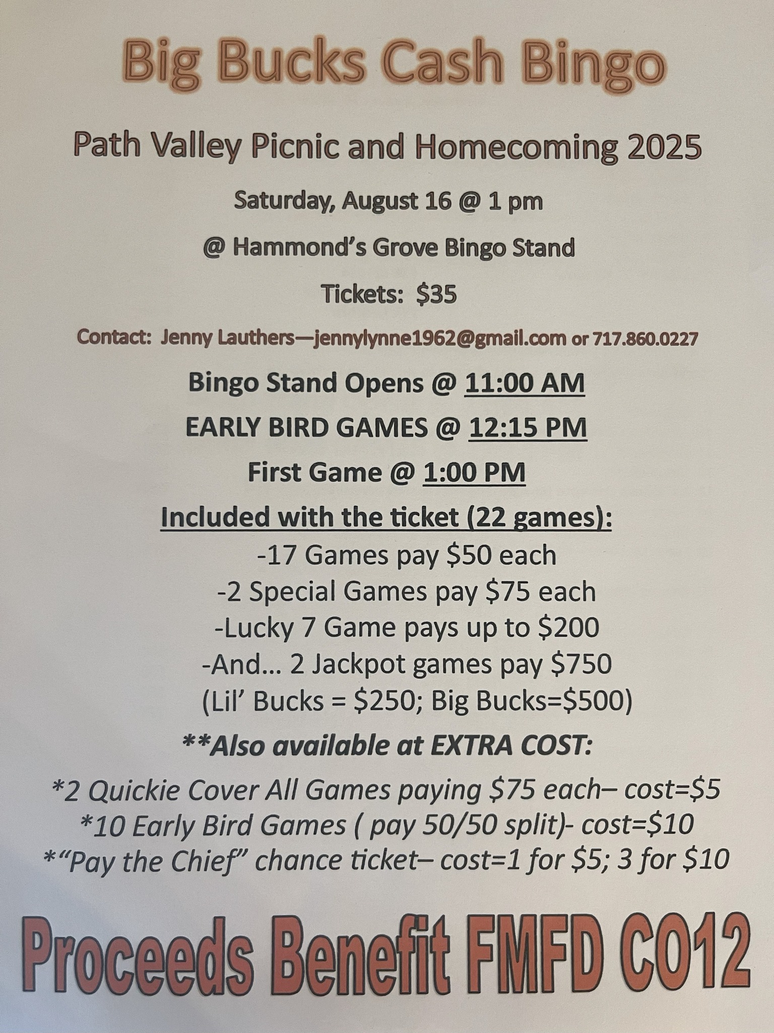 The 118th Annual Path Valley Picnic & Homecoming will be held on August 13-16th! Wednesday – Saturday @ Hammond’s Grove, Spring Run, PA.